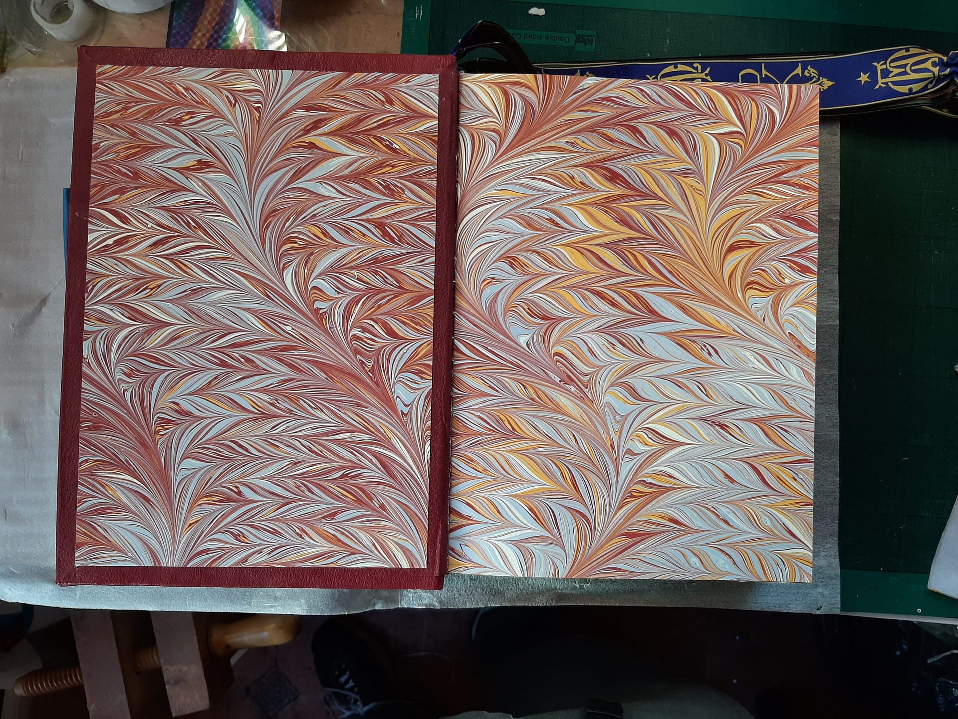 Once the Missal was covered, the finishing touch was the endpapers. This was another first for me – having papers marbled specifically for a project! After some back-and-forth about the effect I wanted to achieve, Rachel Maiden of Maiden Marbling did an exquisite job. She took the colours from the Crucifixion image at the start of the Canon (the featured image at the top of this post), and created the mesmerising ‘fern’ pattern I asked for. These colours then informed my choices for the endbands, so every part of the book was in visual harmony. The sky blue she chose is particularly beautiful in contrast to the crimson.