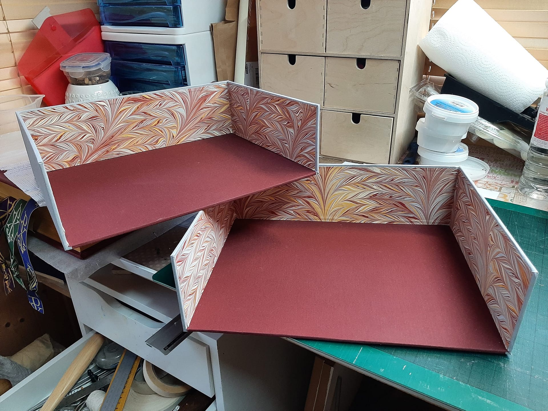 Oh, and I couldn’t resist just one little bit of gold tooling! I thought a tiny Greek cross in gold on the first replacement Missal tab for the start of the Canon Romanum would be just right. Happily, Fr. John agreed! Finally, I made a clamshell box so he could transport it safely to its new home, lining the box with the remainder of the endpapers.