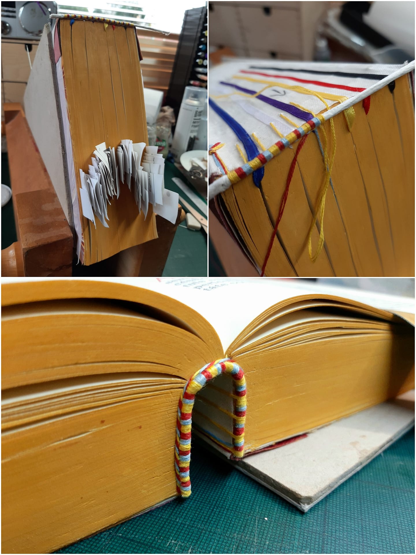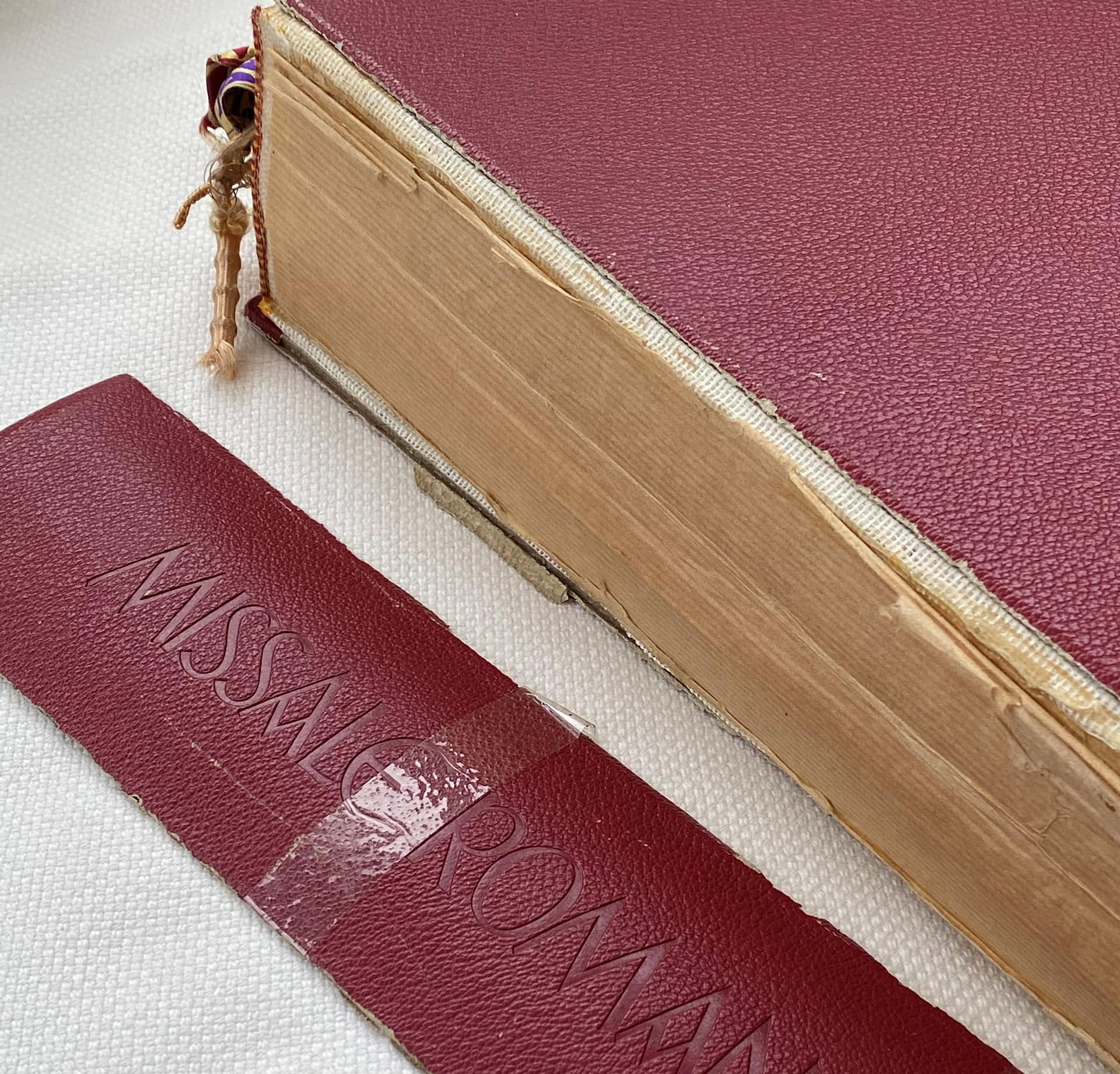 As you can see, the book was given to me in a sorry state. The spine had completely come off, and the bookbinders’ ancient enemy, Cellotape, had been used liberally. Most of the ribbons had frayed or come loose, and the once-bright colour on the page edges was very faded. As you can probably gather, Fr. John works by the principle that “Our Lord deserves the best”, and so for anything relating to the Holy Sacrifice of the Mass, no expense was to be spared acquiring fine (and preferably natural) materials so this Roman Missal would be right at home in this little heavenly chapel of his.