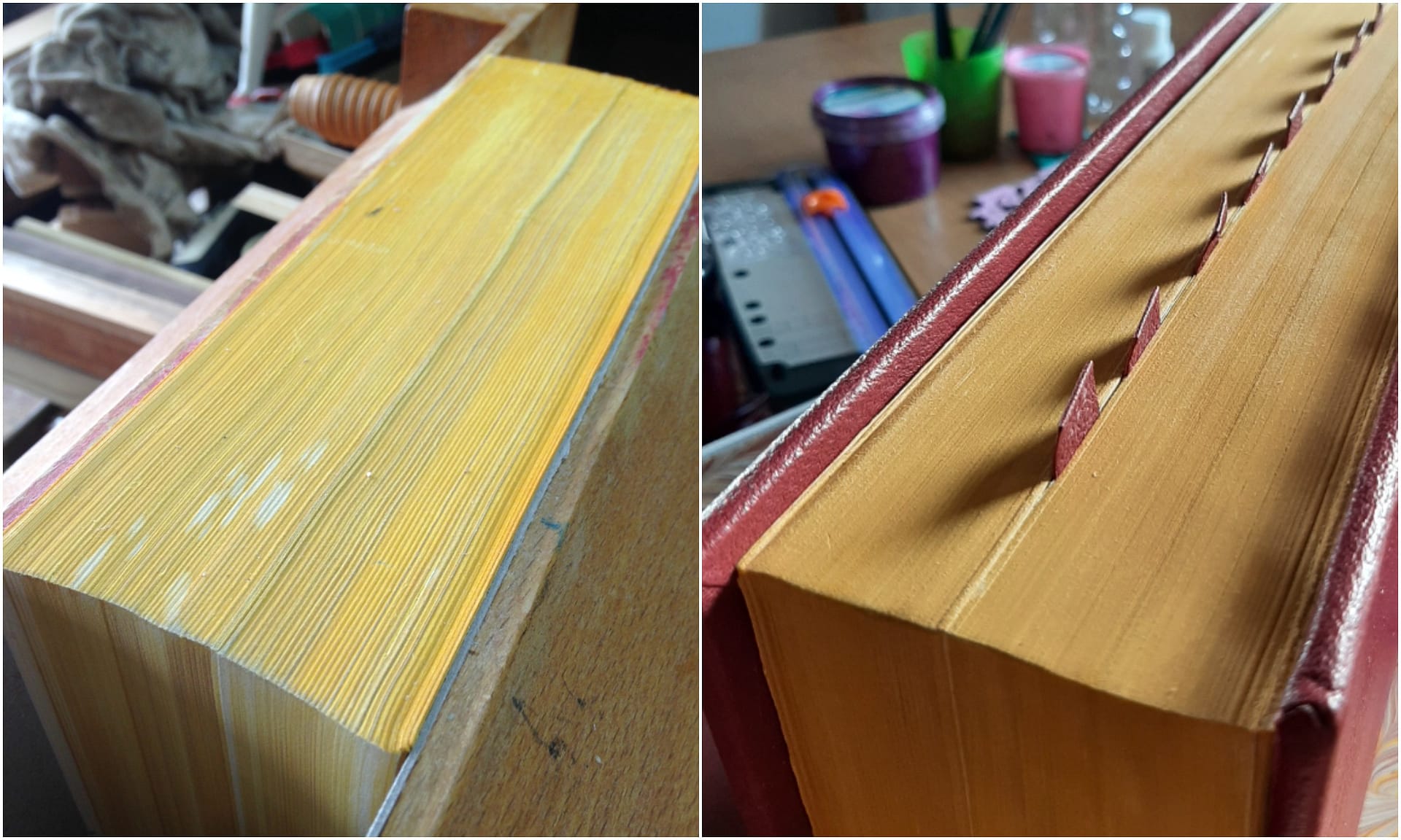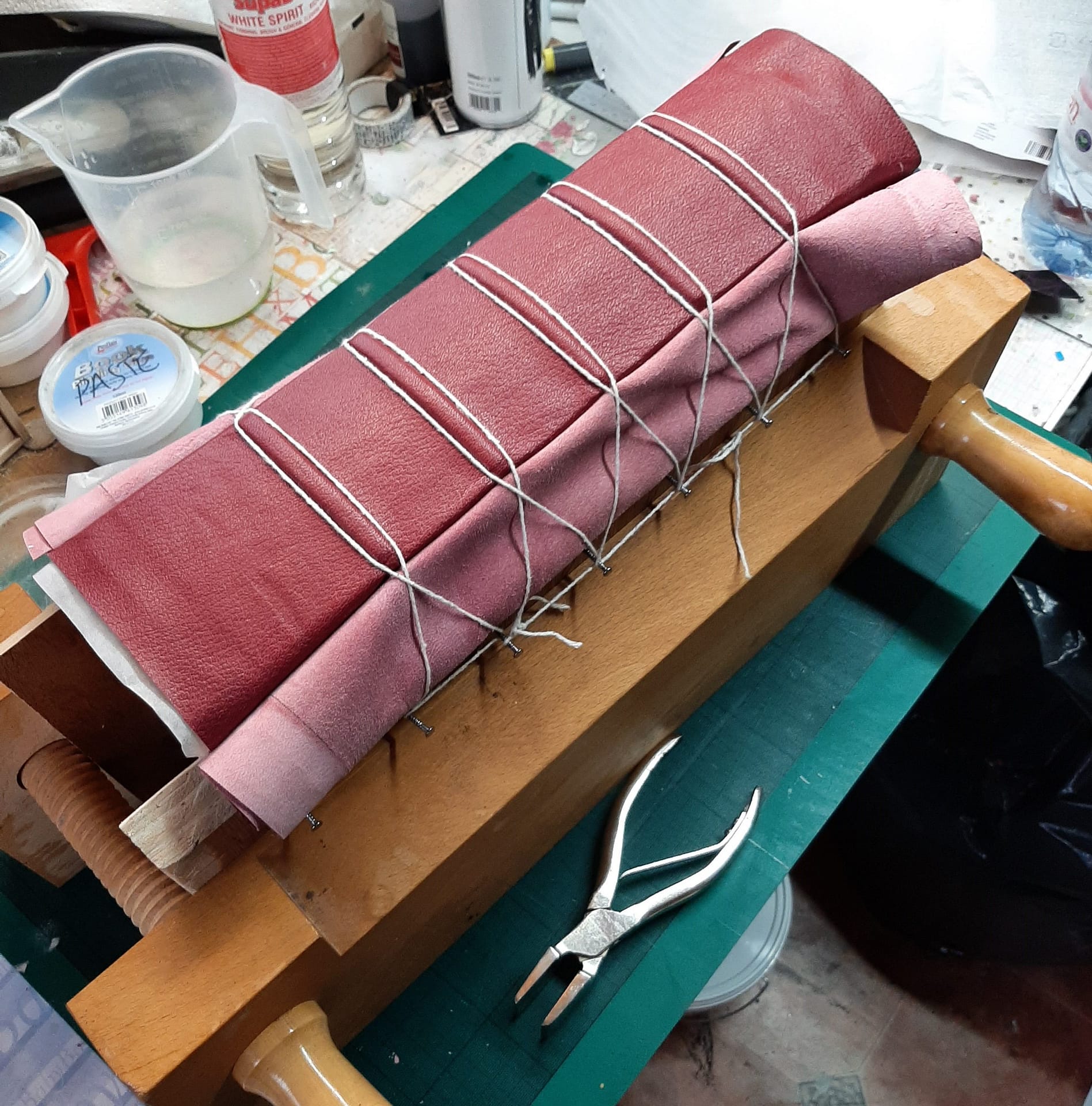 Still, all of this was just preparation for the main event…covering the Missal in its new crimson Moroccan leather. I don’t mind admitting how nervous I was about doing this – it was by far the biggest book I’d worked on, and any ‘lessons learned’ at this moment would certainly have been expensive ones! After a few hours of patiently paring the leather to the desired thickness around the edges and the spine, I felt comfortable moving on to my favourite part of working with leather – ‘bringing up the bands’. This is the process of forming the leather over the 5 raised bands on the spine, at first with band nippers (at the bottom of the picture), then tying it up in the finishing press to make sure the pasted/glued leather really adheres to the shape of those bands. I think it’s something about the interlocking triangles formed by the string which I find satisfying, not sure why. Then it was left overnight to really set in place.