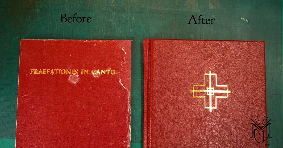 before and after image of a hand Missal with detached cover and collapsed spine restored with new leather cover